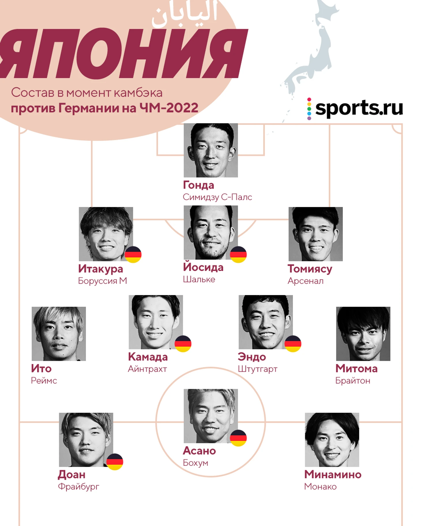 В момент, когда японцы переворачивали матч, легионеров из Бундеслиги на поле было шестеро. Один игрок остался в запасе, один (Ао Танака, он вообще из Бундеслиги-2) вышел в старте, но был заменен – вместо него появился как раз Рицо Доан, который через четыре минуты запустил камбэк.