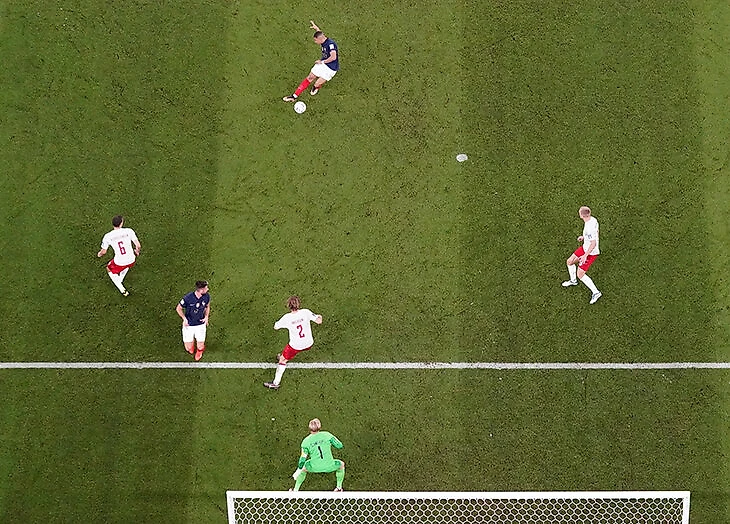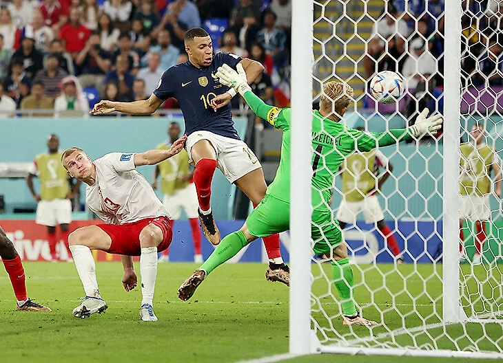 Дания быстро сравняла (помог гол Кристенсена с углового), но Килиан не смирился и добавил второй: резаный кросс Гризманна во вратарскую – и Мбаппе в прыжке бедром вносит мяч в сетку. 2:1 к 86-й минуте.