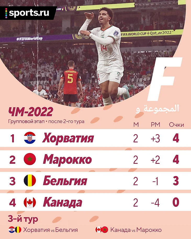 В группе F завершился второй тур: Бельгия неожиданно проиграла Марокко (0:2), а Хорватия разгромила Канаду (4:1).