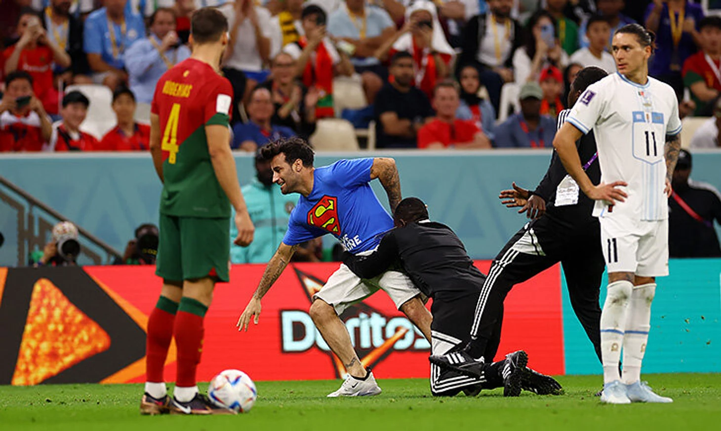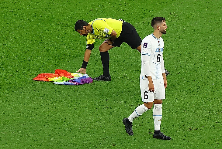 На 51-й минуте игры Португалия – Уругвай на газон вырвался мужчина с радужным флагом. Пробежав за центральный круг, он бросил флаг на траву (вскоре его поднял арбитр).
