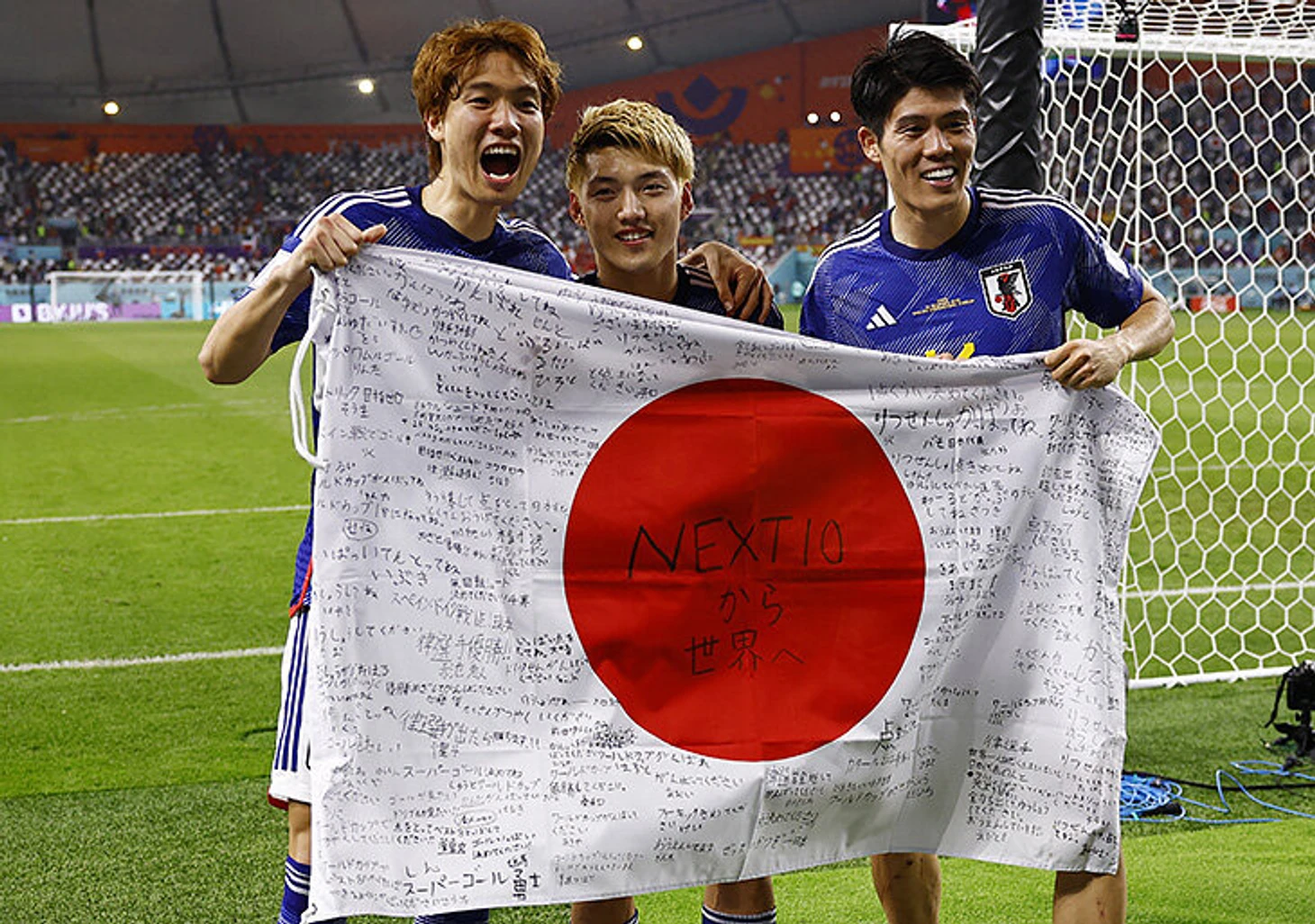 А японские футболисты праздновали первое место в сложнейшей группе с болельщиками. Ведь поддержка от фанатов ощущалась – команде передавали такие флаги с пожеланиями.