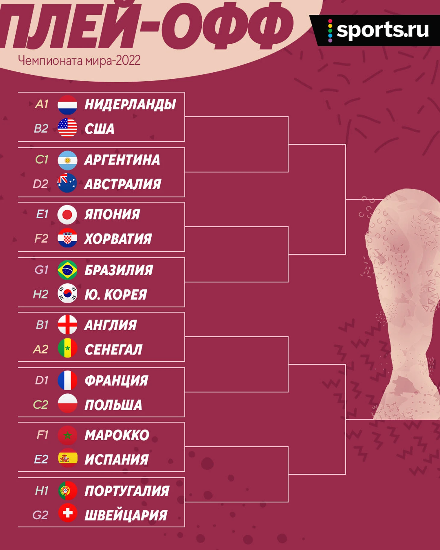 Теперь мы знаем полную сетку плей-офф. Ее дополнили пары: Португалия – Швейцария и Бразилия – Южная Корея.