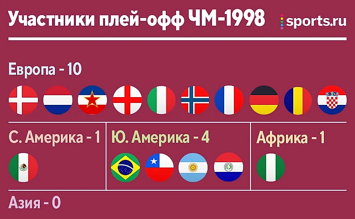 ЧМ-1998 не подарил каких-то необычных раскладов – снова 10 команд от Европы и 4 – от Южной Америки.