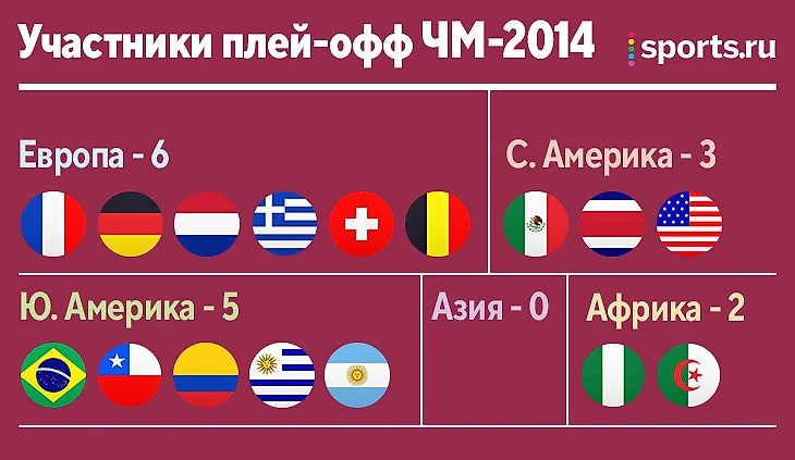 На ЧМ-2014 Европа снова была представлена в плей-офф лишь шестью командами, а Южная Америка – пятью. Стоит отметить Северную Америку – их конфедерация отправила в раунды на выбывание аж три команды. Африка же впервые с 1990 года была представлена в плей-офф двумя сборными.