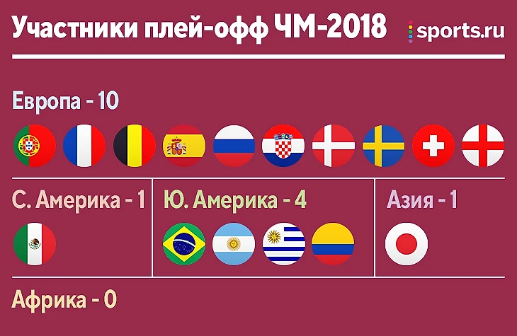 УЕФА в доминирующей позиции – 50% от всех сборных. Южная Америка представлена только Аргентиной и Бразилией, зато от Азии в плей-офф будет аж три участника – большой успех для местной конфедерации.