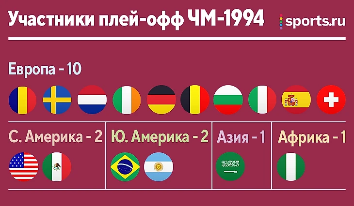 На ЧМ-1994 в плей-офф попали представители всех конфедераций. Опять 10 команд от Европы, по две – от обеих Америк и по одной – от Азии и Африки.