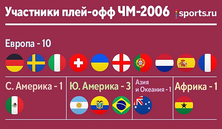 Уже на ЧМ-2006 Европа снова двинула 10 представителей в плей-офф. От Южной Америки туда отправились три сборных. По одной национальной команде представляли Северную Америку, Азию и Океанию, а также Африку.
