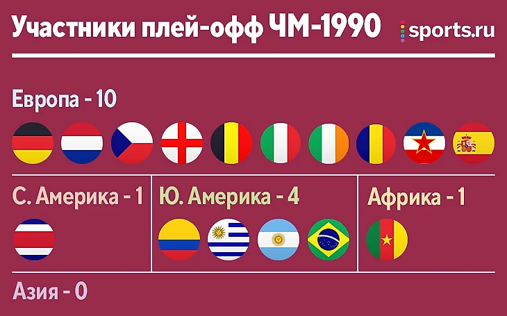 Просканировали таким образом все чемпионаты мира за последние 32 года. На ЧМ-1990 европейских команд было аж 10 штук. Все южноамериканские представители вышли из своих групп. По одной команде в плей-офф отправили Африка и Северная Америка. Азия – совсем мимо.