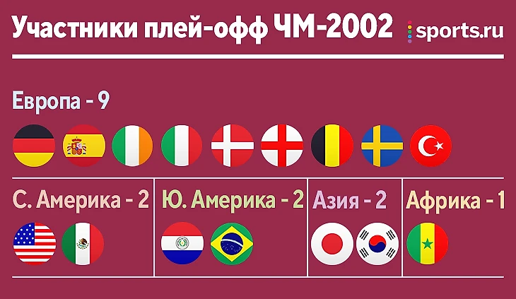 На ЧМ-2002 Европа впервые с 1990 года сократило представительство в плей-офф – вместо 10 команд в раунды на выбывание вышли только 9. Северную и Южную Америки, а также Азию представляли по две сборные. Из африканских представителей в плей-офф вышел только Сенегал.