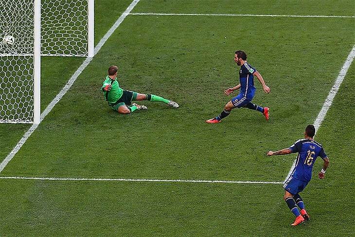 Но. Единственным в тот день игроком, который получил возможность БЕЗ СОПРОТИВЛЕНИЯ выйти на один с вратарём и забить ИЗ УБОЙНЕЙШЕЙ ПОЗИЦИИ, был Игуаин. Ему случайно скинул мяч игрок Германии и Гонсало выходил на Нойера с гандикапом в метра три от ближайшего защитника немцев. Таких подарков судьбы в финале чемпионата мира я не вспомню. Что сделал Гонсало с этим подарком? Пробил на метр мимо. На метр, без преувеличения. Топовый форвард в такой ситуации должен забивать 99 раз из 100.