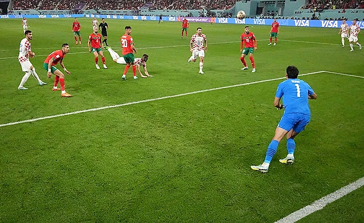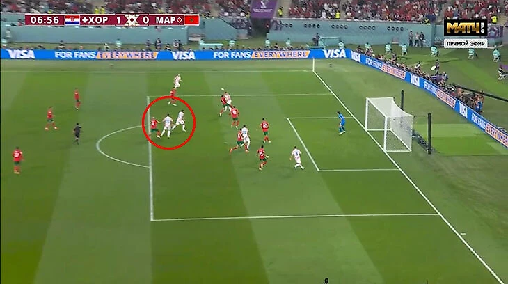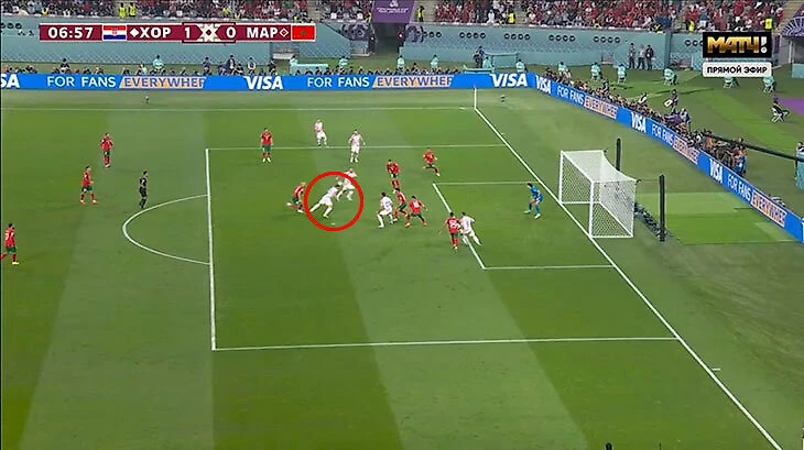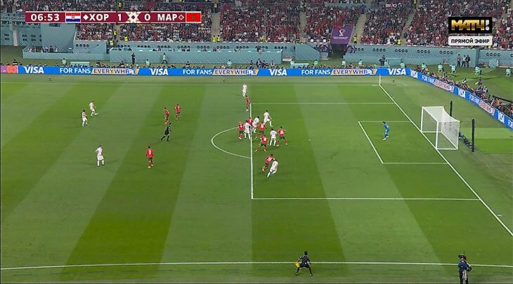 На 7-й минуте Хорватия удивила заготовкой при розыгрыше далекого штрафного – зацените геометрию. Лука Модрич пробежал мимо мяча, а Ловро Маер подал в штрафную левее центра. Там как раз свободная зона, марокканцы сосредоточились в центре.