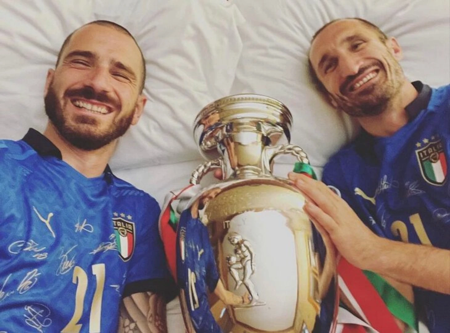 Это уже целая традиция – лидеры чемпионов забирают трофеи и проводят с ними первую ночь. Обычно кубки достаются капитанам. Вот, например, Кьеллини и Бонуччи после победы на Евро.