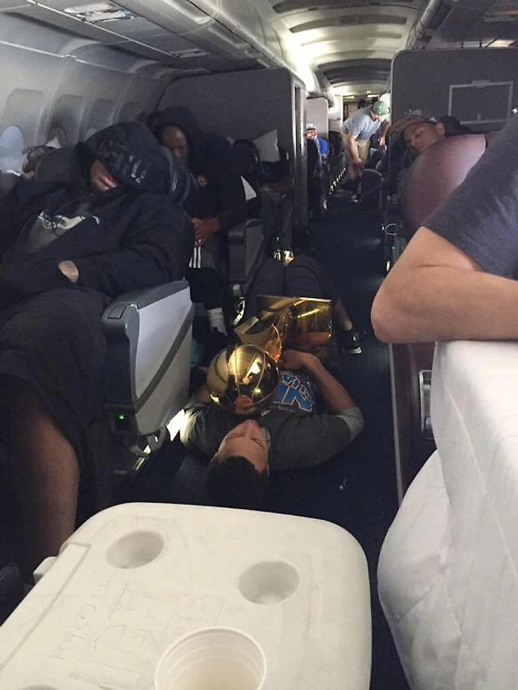А Стеф Карри ради сна с Кубком Ларри О’Брайена он вытянулся в проходе самолета.