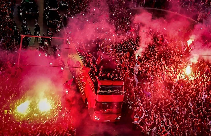 На улицы Работа вышли десятки тысяч жителей, чтобы поприветствовать красно-зеленый автобус.
