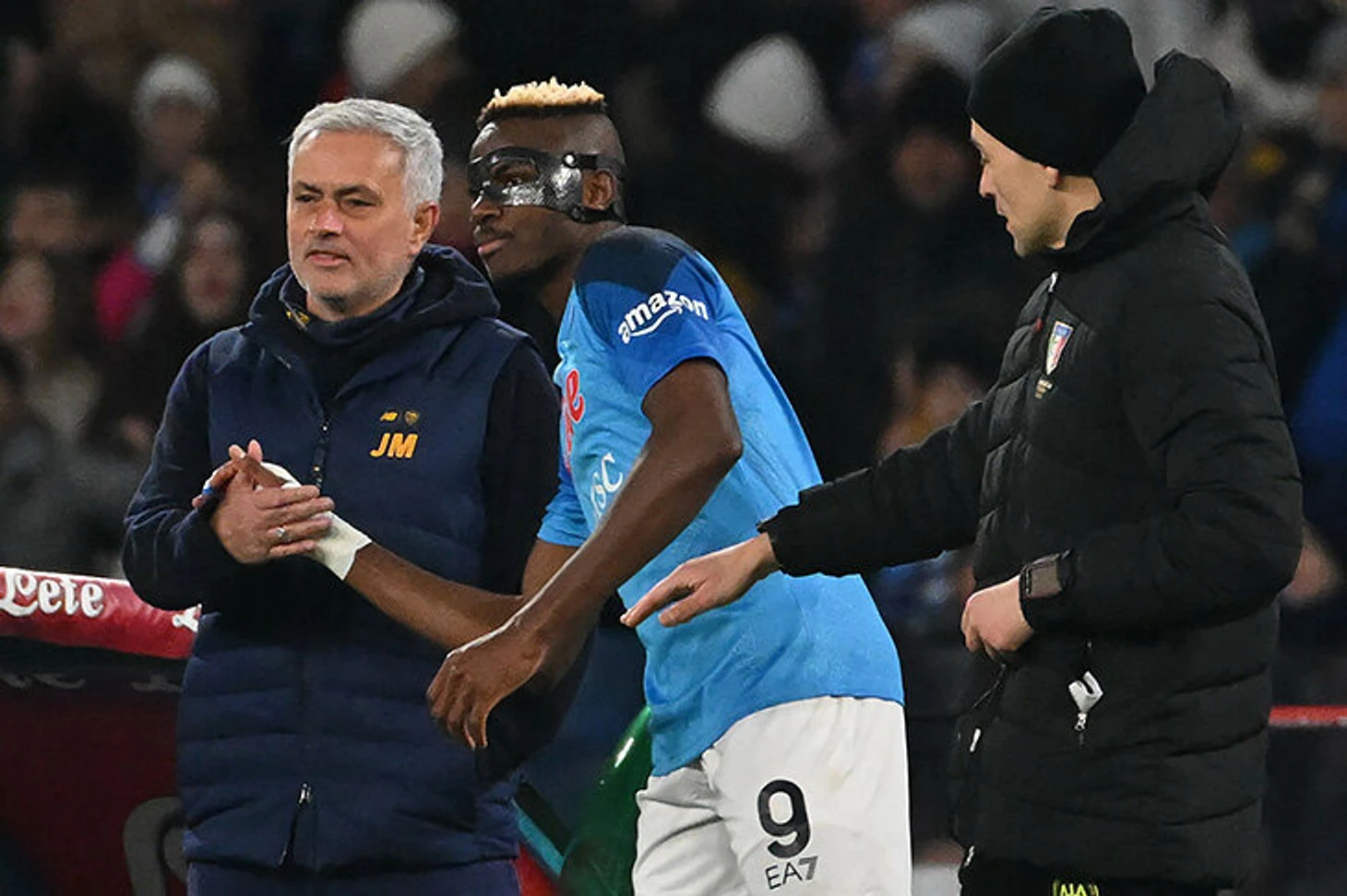 Прямо во время матча «Наполи» – «Рома» Жозе Моуринью и Виктор Осимхен пожали друг другу руки и перекинулись парой фраз.