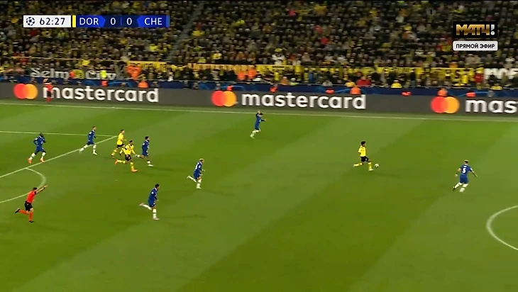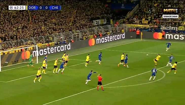 На 63-й минуте «Челси» опасно разыграл угловой: подача, Кай Хавертц скинул на дальнюю штангу, Жоау Феликс не смог перевести мяч в ворота. Снова суета в центре штрафной, мяч свалился ближе к краю, и оттуда Рафаэль Геррейру разрядил ситуацию, выбив из штрафной через себя.