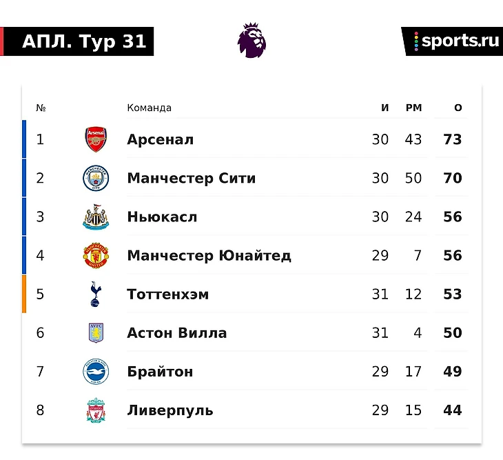 За «Сити» и «Арсеналом» и их чемпионской гонкой плотнейшая борьба за места в еврокубках. В ней участвуют «МЮ», «Ньюкасл», «Тоттенхэм», «Брайтон», «Ливерпуль», а теперь внезапно ворвалась и «Астон Вилла» Унаи Эмери.