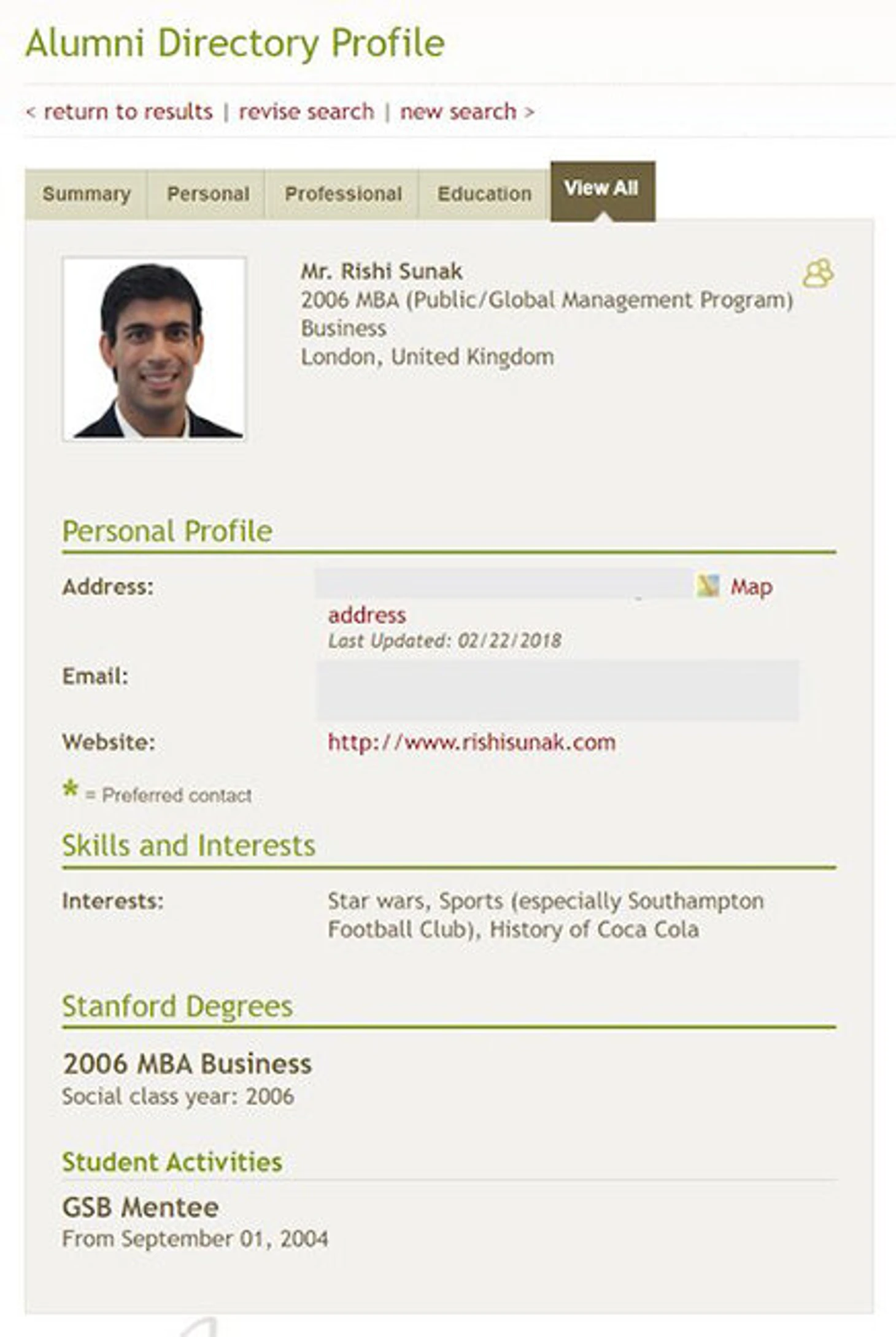В сети есть студенческий профиль Сунака – в его интересах там числится спорт («Саутгемптон» выделен отдельно), «Звездные войны» и история «Кока-колы».
