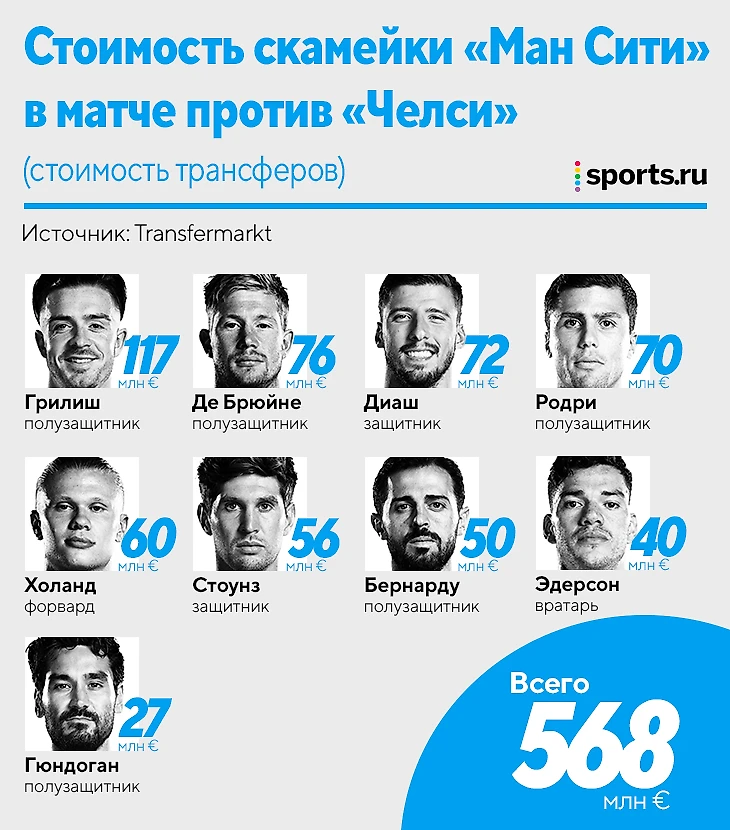 Похожую по ценнику лавку у «Ман Сити» мы уже видели в январе – тоже в игре с «Челси», но уже в Кубке Англии (4:0). Тогда вышло сильно скромнее, потому что на скамейке сидел Рико Льюис.