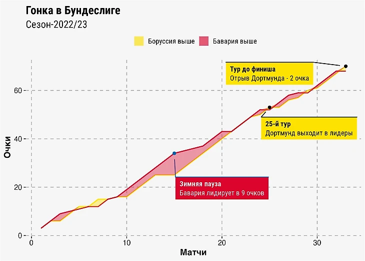 После 13-го тура вперед снова вышла «Бавария» – и не отдавала лидерство до 25-го тура, по итогам которого мюнхенцев обогнала «Боруссия». Дортмундцы совершили впечатляющий камбэк: после 15-го тура они ушли на зимнюю паузу с отставанием от «Баварии» в девять очков.