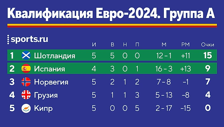 Испанцы после гостевых 0:2 от Шотландии взбодрились, у них две шикарные победы подряд. В прошлом туре разорвали Грузию 7:1. Общий счет за два матча: 13:1!