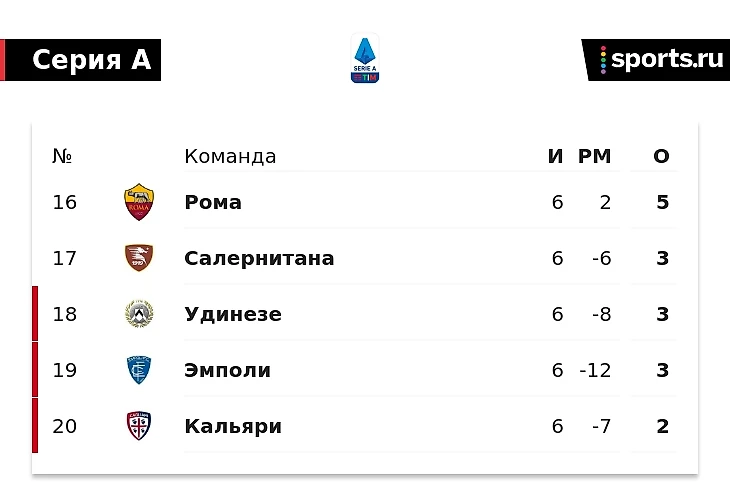 Ниже римлян на данный момент лишь четверо: «Салернитана», «Удинезе», «Эмполи» и «Кальяри».