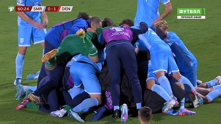 Невообразимое случилось позже: гол Сан-Марино! Алессандро Голинуччи после подачи углового внезапно остался один в штрафной – и мяч после его удара отрикошетил в ворота от Симона Кьера. Праздновать побежали все!