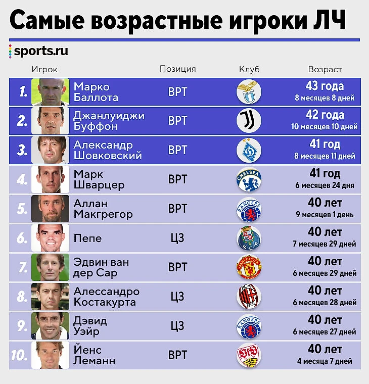 ● Если отсечь защитников, то самым возрастным остается Райан Гиггз – в апреле 2014-го он сыграл с «Баварией» за «Ман Юнайтед» в 40 лет 4 месяца и 3 дня.