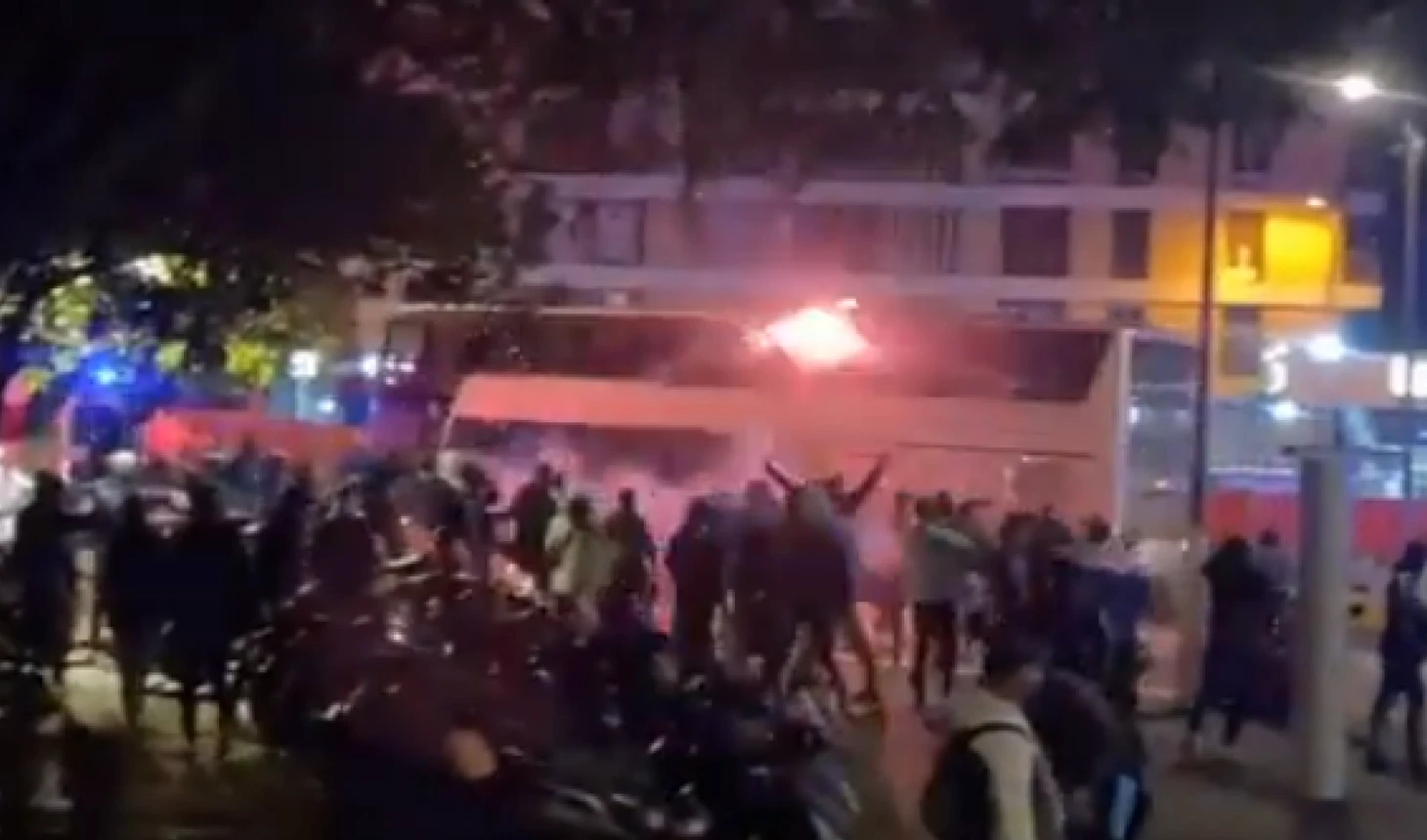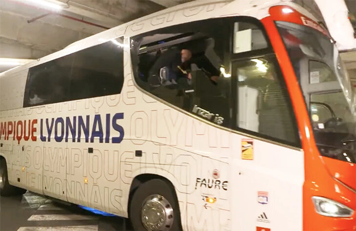 Перед «Велодромом» автобус с игроками и тренерами «Лиона» атаковали: бросали камни и файеры. Все проходило на улице. Вот момент попадания файера в автобус.
