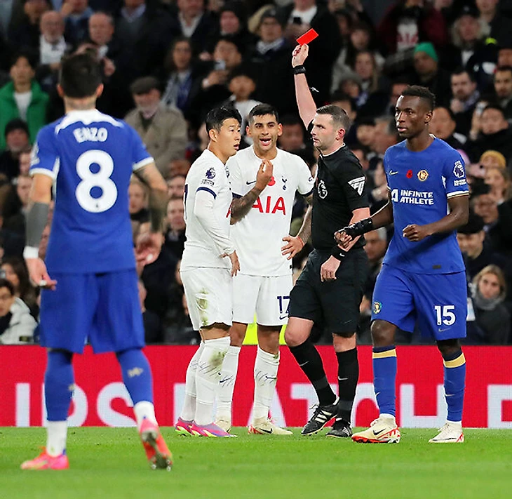 🟥 И в этом же эпизоде Оливер показал красную! Перед голом «Тоттенхэм» в рискованной манере отбивался внутри штрафной – и Кристиан Ромеро заехал в щиток Энцо Фернандесу. Оливер сбегал к монитору – это красная и пенальти. Это уже четвертое удаление Ромеро за два года в АПЛ – больше за это время нет ни у кого в лиге.