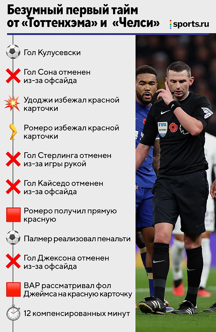 Тайм вдевятером, 5 отмененных голов, 22 дополнительные минуты. Безумие «Челси» и «Тоттенхэма» 🔥