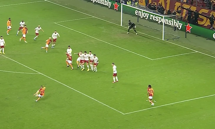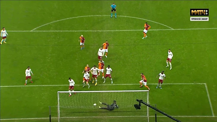Хаким Зиеш готовился бить штрафной значительно правее от центра. Обратите внимание на две детали: два игрока «Галатасарая» между основной стенкой «МЮ» и дополнительным человеком чуть сбоку.