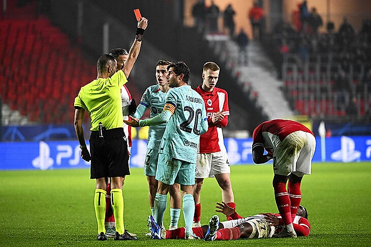 Арбитр Марко Гуида сначала показал красную, но после просмотра ВАР поменял на желтую.