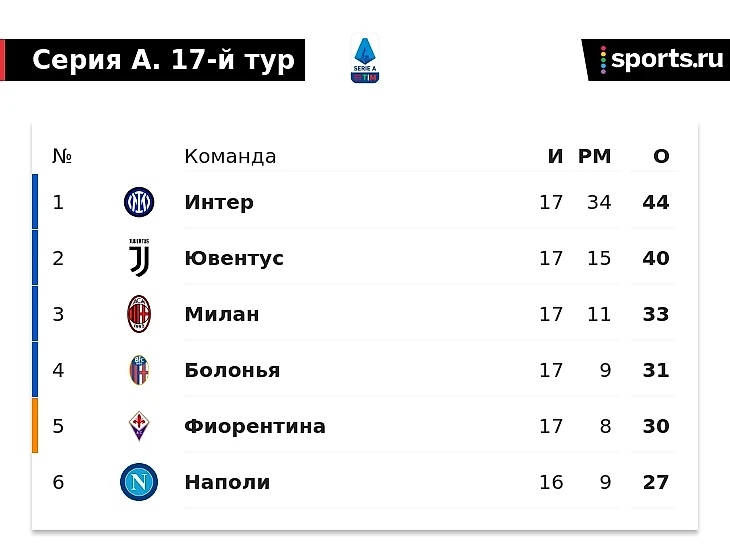 «Интер» – зимний чемпион Италии. В 2023-м остался только матч с «Дженоа», на четыре очка отстает «Ювентус». Сильно позади «Милан» и «Болонья».