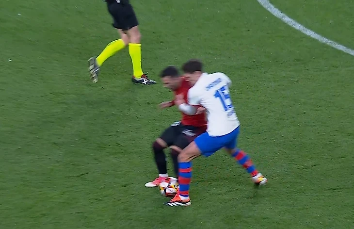 На 32-й минуте Рафинья после перехвата в центре поля и помчал к чужим воротам, а защитник Алехандро Катена в последний момент подтолкнул его – и игрок «Барселоны» не удержался на ногах.