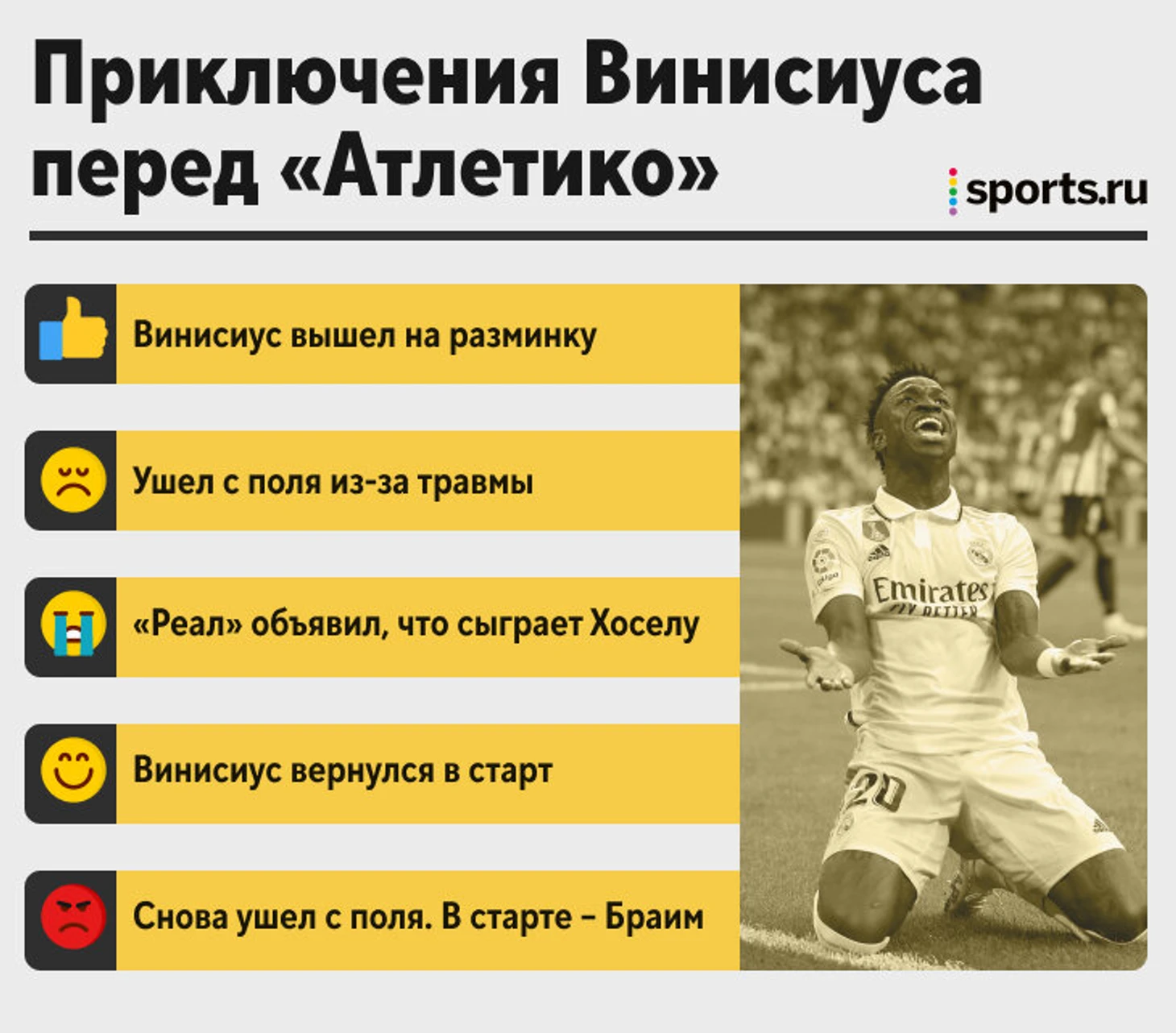 Метаниями «Реала» шокирована даже Ла Лига. Написали: «Уже третий состав «Реала», который мы получаем перед матчем с «Атлетико». Один с Винисиусом, другой без него и с Хоселу, а потом уже с Браимом Диасом».