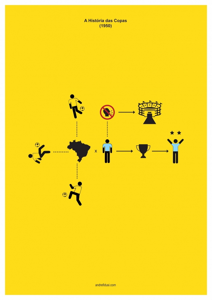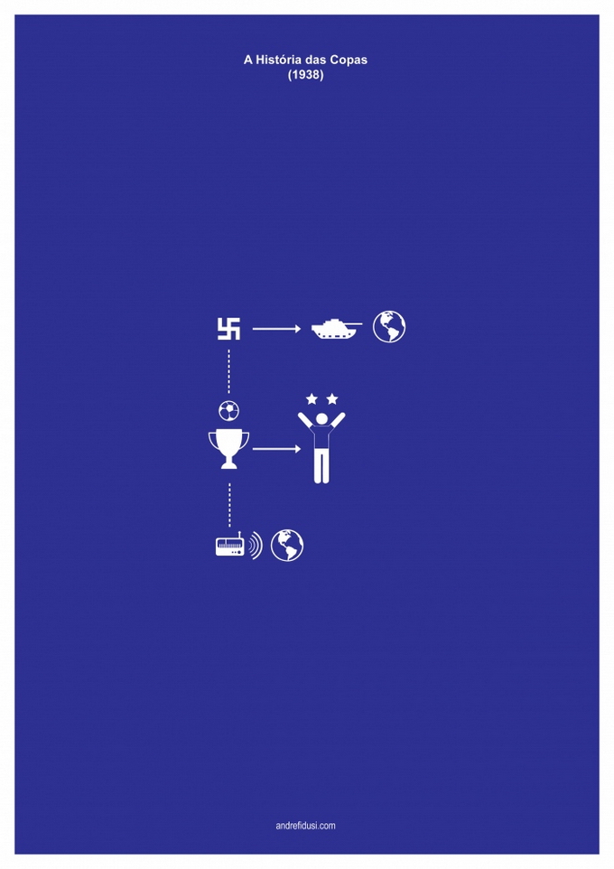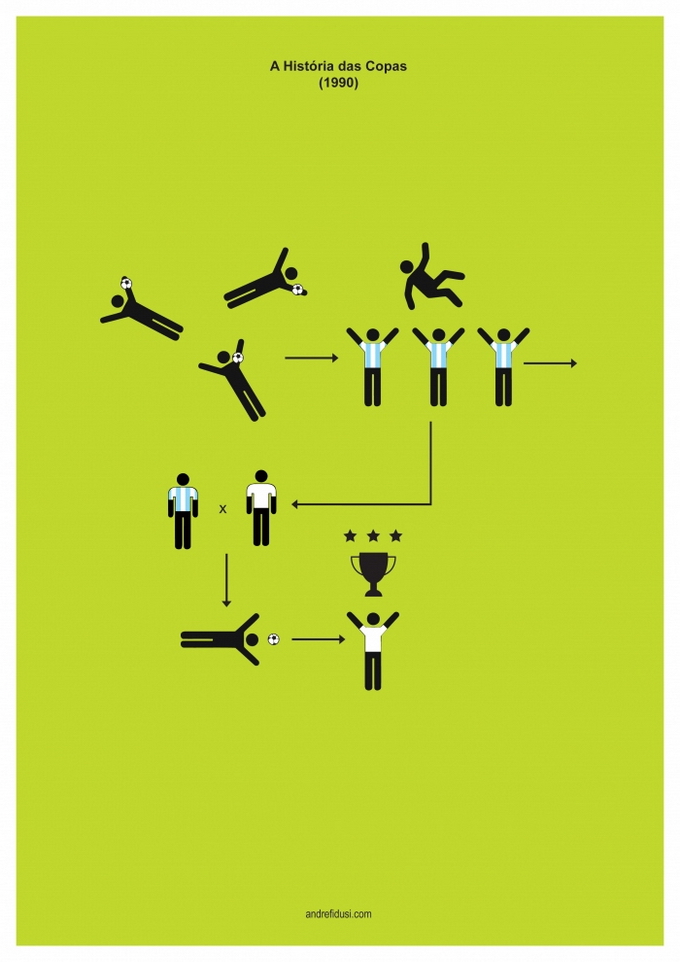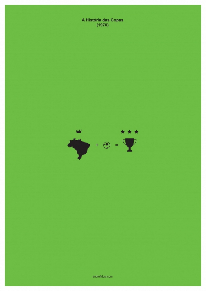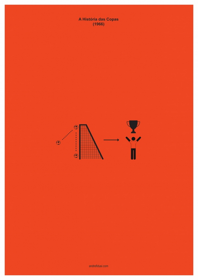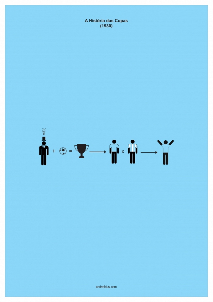 35-летний бразильский дизайнер Андре Фидуси (Andre Fidusi) создал серию минималистских постеров, изображающих все финалы чемпионатов мира по футболу в предельно сокращенном графическом виде.