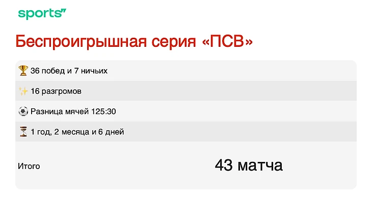 «ПСВ» уступил 1:3 «НЕК» и прервал лучшую беспроигрышную серию в чемпионате в клубной истории: 43 игры! Прошлая растягивалась на 35 матчей в сезонах-1977/78, 1985/86 и 2000/01.