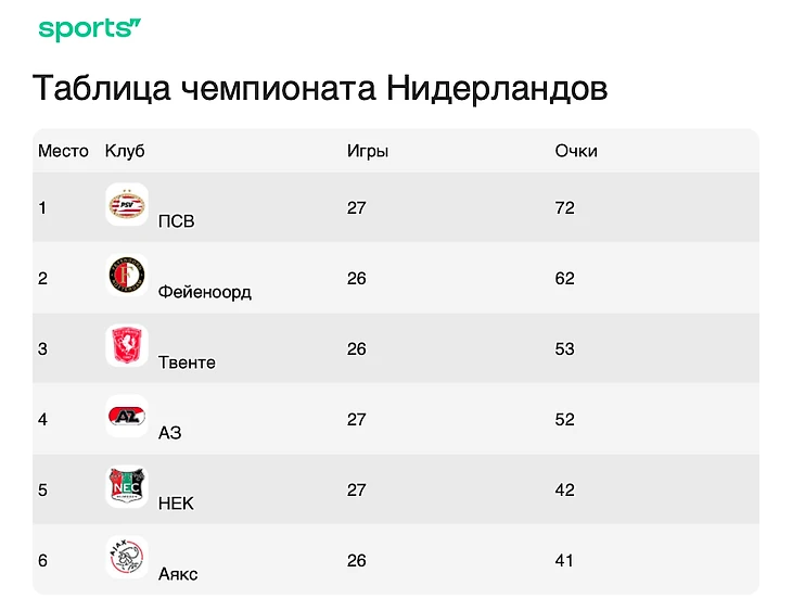 Несмотря на поражение, «ПСВ» все еще на вершине: с матчем в запасе оторвался от второго места на 10 очков. Правда, если «Фейеноорд» обыграет 31 марта «Утрехт», то дистанция сократится до семи.