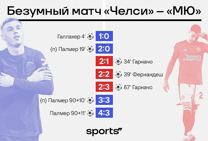90+11’ Коул Палмер – 4:3. И он же хет-триком вывел этот сюжет куда-то в высочайший космос. Когда тут же, через 82 секунды, нашел свободнейшую зону на углу штрафной перед угловым. Прямо даже поозирался по сторонам, когда понял, что никто не следит. Да, в итоге помог рикошет от Скотта Мактоминея, но главный ход, благодаря которому стал возможен удар – все равно эта находа зоны Палмера.