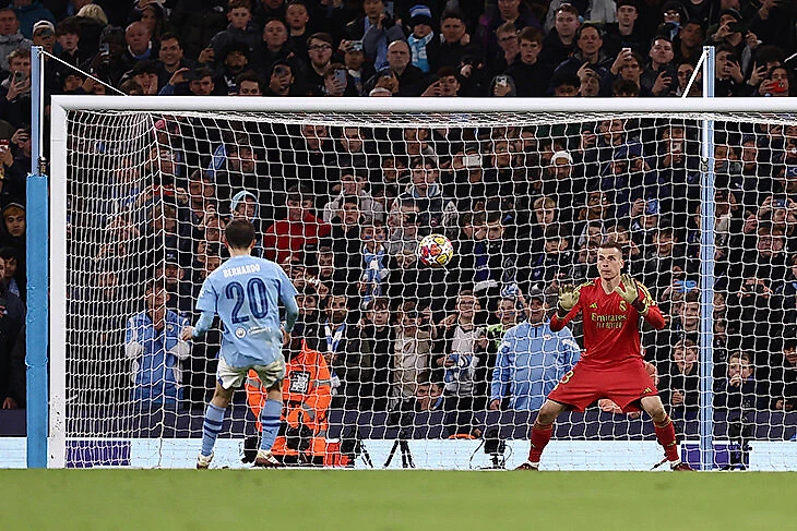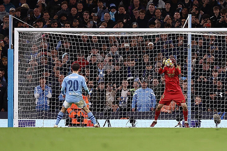 Когда бил Бернарду Силва, Андрей остался по центру – и вот так легко поймал мяч двумя руками.