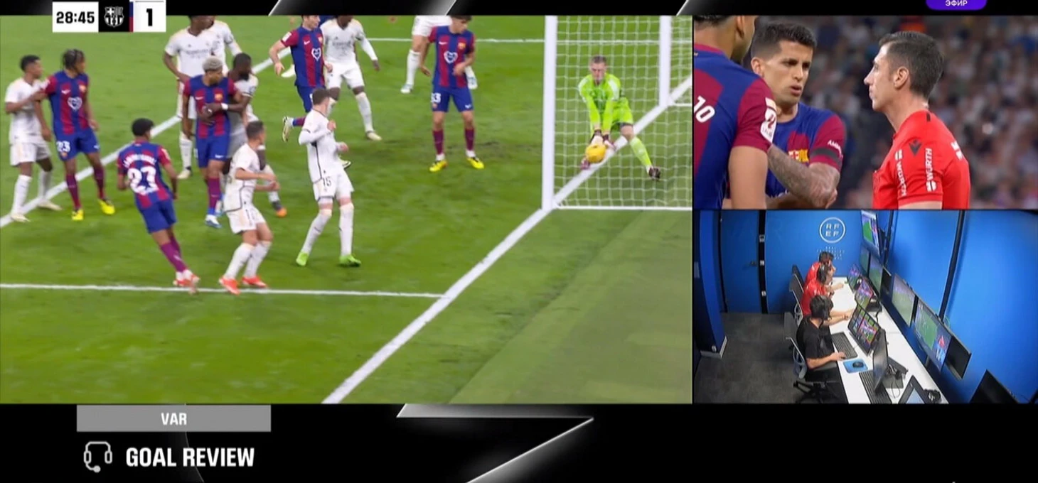 На 29-й каталонцы едва не вышли вперед. Ламин Ямаль подправил пяткой кросс с углового – а Лунин отбил на линии ворот (или уже за ней?). ВАР посмотрел эпизод – и посчитал, что Андрей чудом успел спасти и не допустить второго мяча с углового.