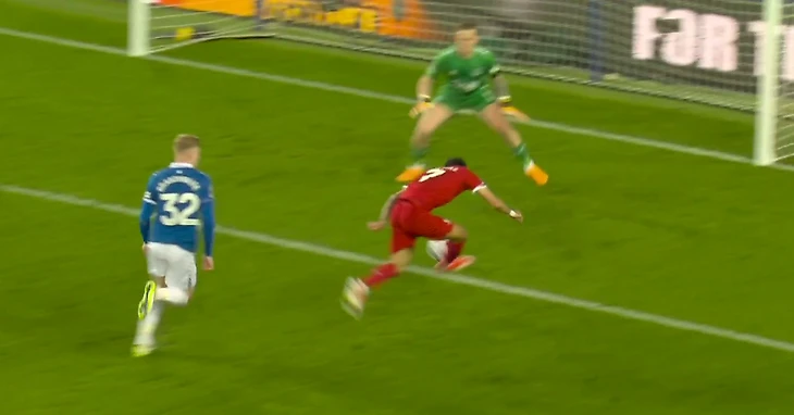 Несмотря на скверное начало, «Ливерпуль» вполне мог выиграть первый тайм. Например, вот из такой позиции Дарвин Нуньес попал прямо в Джордана Пикфорда.