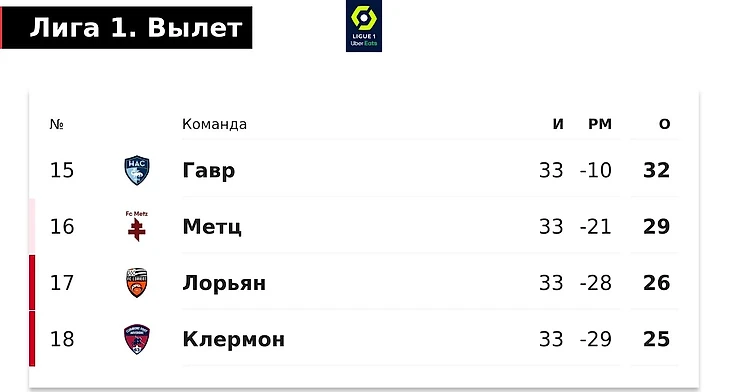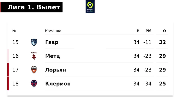 В последнем туре «Метц» проиграл «ПСЖ» (0:2), «Лорьян» победил «Клермон» 5:0. Команды сравнялись и по количеству очков, и по разнице забитых и пропущенных – напомним, это первый показатель при равенстве очков.