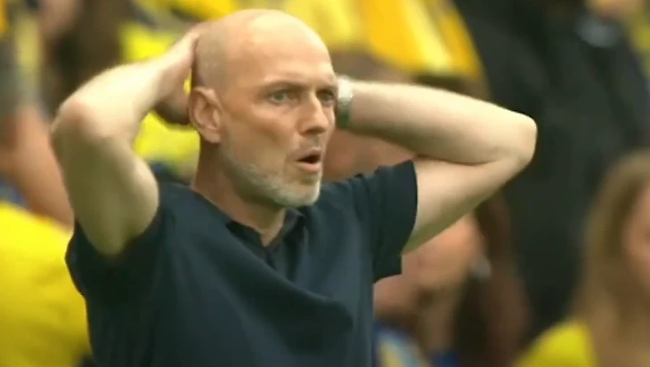 А на другом стадионе так выглядел шок. На скрине тренер «Брондбю» Йеспер Соренсен.