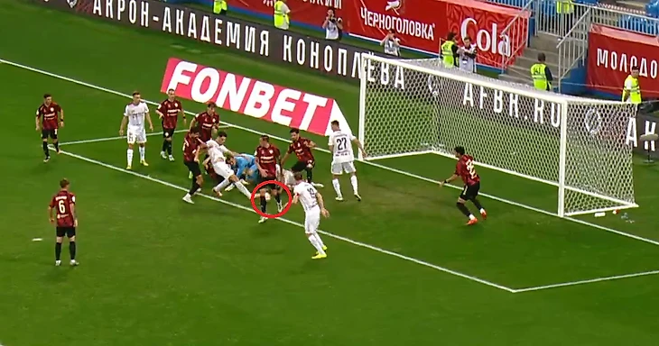 Или был фол на голкипере? Но смотрели не его, а именно «вне игры», подтверждал титр. Учитывая, что вратарь находится впереди двух защитников, офсайд нужно считать по защитнику «Акрона» в центре вратарской. Он вообще главное действующее лицо эпизода.