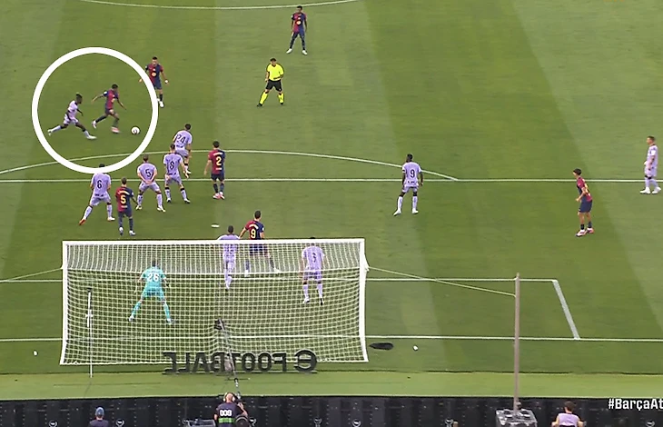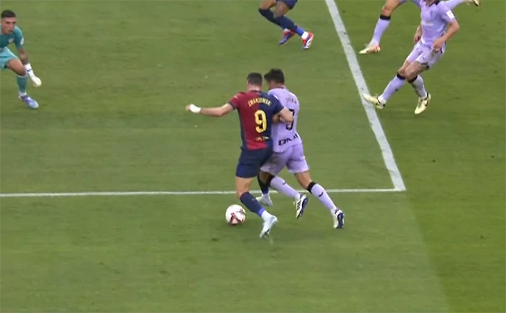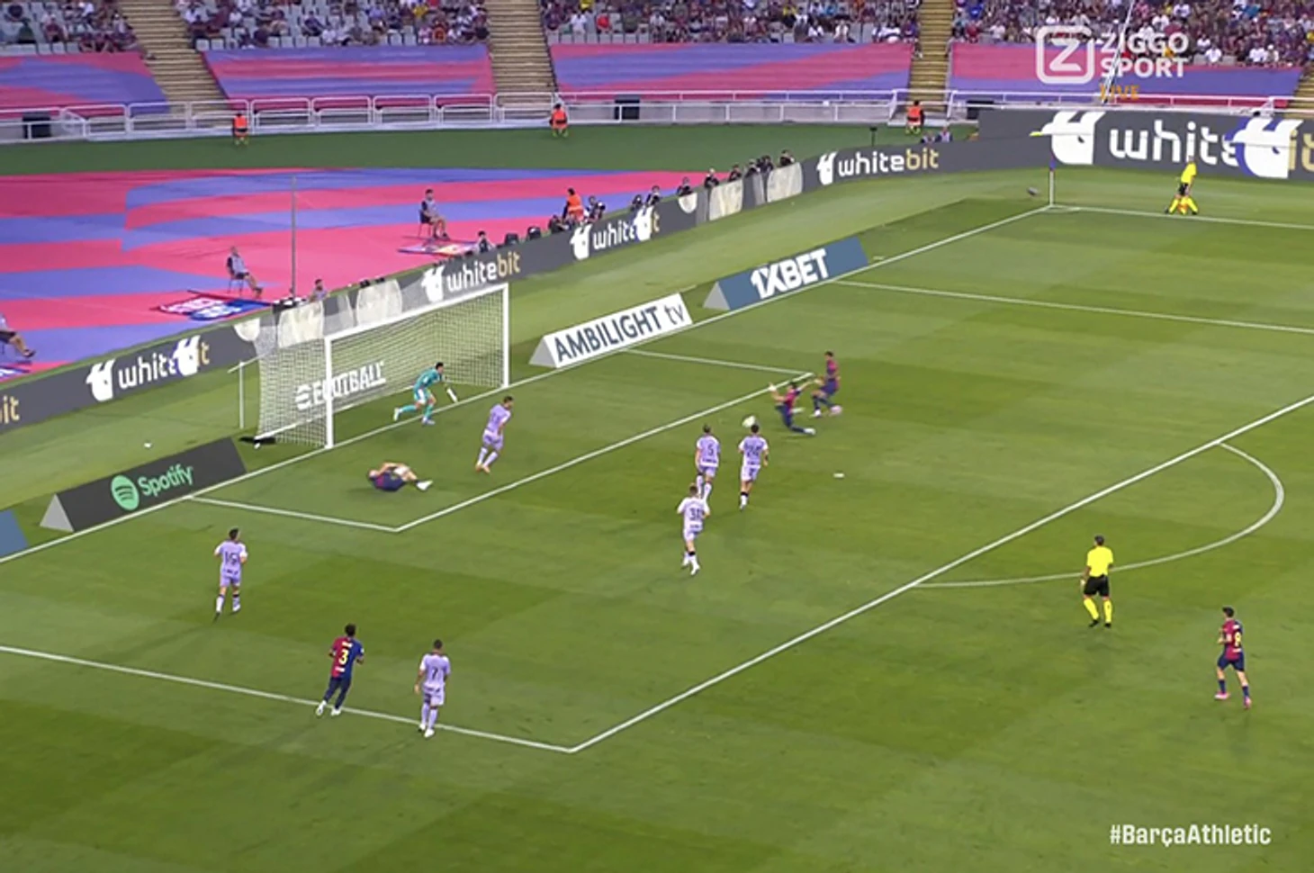 На 40-й минуте произошло нечто редкое: вингер Алекс Беренгер прошел в штрафную «Барсы», там же получил по ногам от Пау Кубарси. Однако арбитр Хесус Хиль Мансано не свистнул – не заметил фол и дал продолжить.