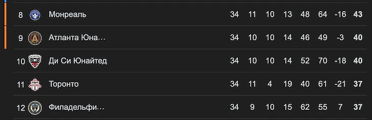 «Торонто» самоустранилось раньше всех, завершив сезон еще до паузы на игры сборных. Так «Атланта» запрыгнула в самый последний вагон плей-офф, обошли «Ди Си» за счет лучшей разницы мячей.