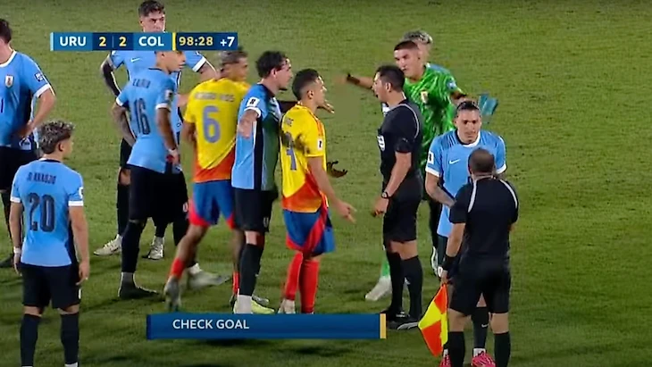 На 96-й минуте колумбийцы затолкали мяч в сетку – 2:2. Уругвай очень возмущался: перед голом могло быть нарушение правил. Но судьи рассмотрели эпизод и фола не увидели.
