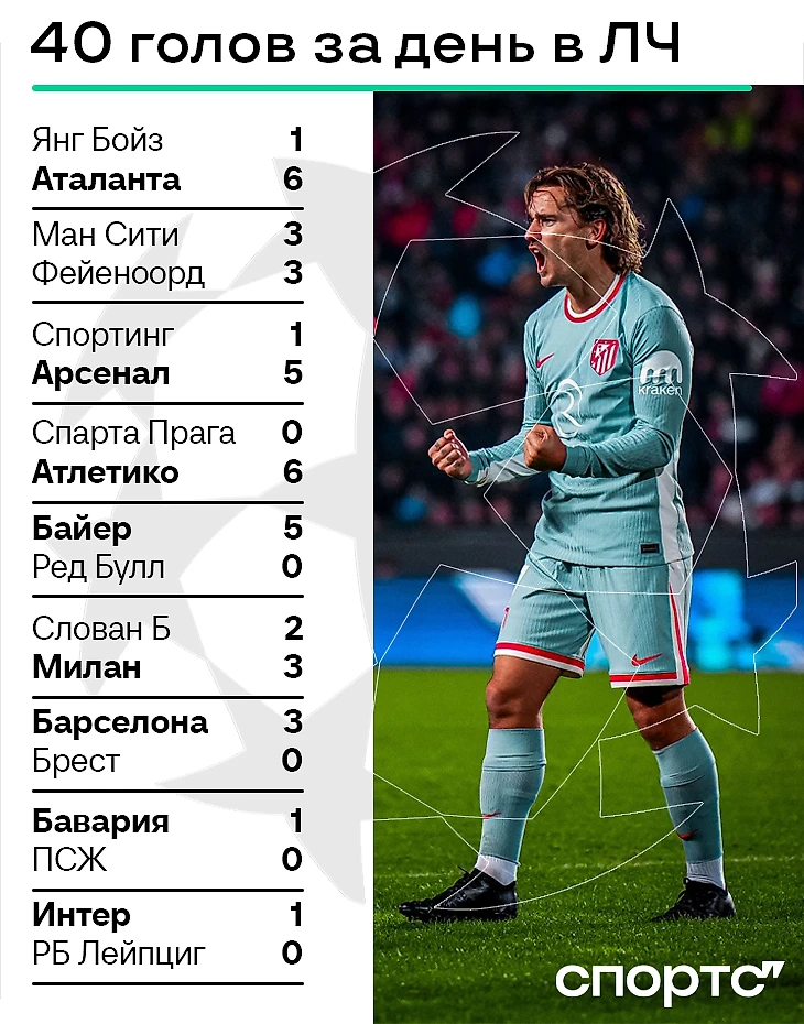 Пятый тур Лиги чемпионов стартовал крайне результативно: за девять матчей вторника команды наколотили аж 40 голов. Меньше трех мячей забили только в двух играх.